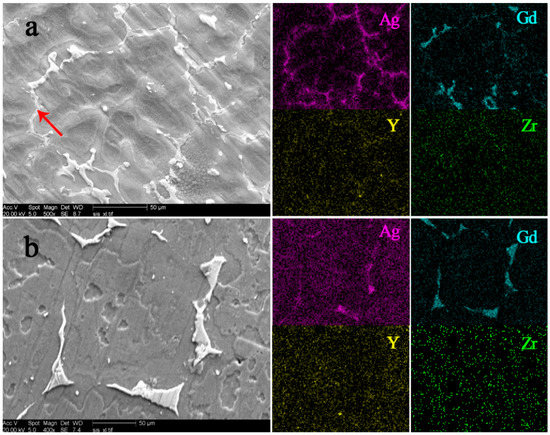 SEM and EDS mapping images of GWQ1032K alloy: (a) as-cast; (b) solid solute (T4).