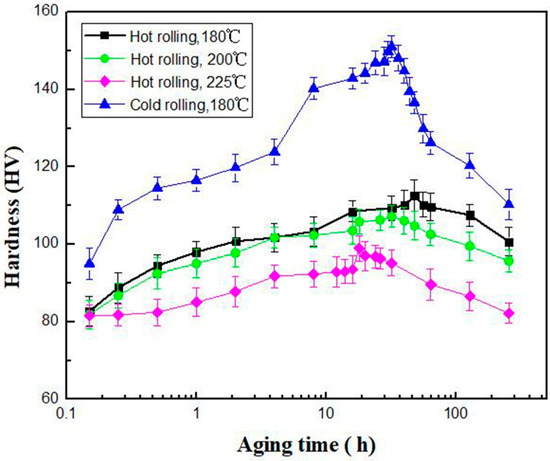 Precipitation strengthening is another effective way to improve the mechanical properties of Mg alloys. It is known that the second phase after aging in nano-scale is effective in blocking dislocation motion [36,37]. Figure 6 shows the hardness evolution after aging treatment at 180 °C, 200 °C and 225 °C, respectively, for GWQ1032K alloy rolled at 450 °C with 80% reduction. It is revealed that the aging hardening at 180 °C is the most prominent, with the peak at 48 h. The aging hardening is weakened with the increase of aging temperature. At the same time, the aging peak has a tendency for earlier shift. The peak time is reduced about ~20 h from 225 °C to 180 °C. In general, for the hot-rolled GWQ1032K alloy, aging hardening ability is limited with a hardness amplification within 30 HV. However, distinct aging hardening is found in sample prepared by the two-step route when aging at 180 °C. The hardness increases from 95 HV to 150 HV with the amplification as twice as that of hot-rolled Mg alloys. Meanwhile, the peak holding time is just 32 h. The increase of 40 HV in peak hardness may attributed to the following two factors: (a) the increase of 10 HV is due to grain refinement from recrystallization; (b) the extra 30 HV is due to aging hardening behaviors.