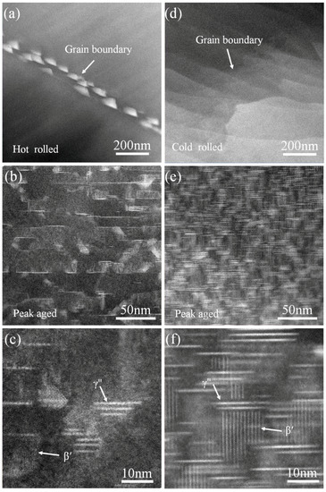 Since the atomic number of RE is higher than Mg, Z-contrast can be clearly observed by high angle annular dark field-scanning transmission electron microscopy (HAADF-STEM) at the RE-rich locations. Figure 7a shows a large amount of high density second phase with RE-rich precipitates along the grain boundaries in the hot-rolled sample. The average size of the precipitation is ~40 nm. The nano-scale precipitation results from the dynamic precipitation of the supersaturated GWQ1032K alloy during hot rolling [26,38]. The segregation of RE at grain boundary is mainly attributed to the following two factors: firstly, defects such as dislocation tend to accumulate at the grain boundary in deformed samples [31,39]; secondly, the grain boundary shows a more severe lattice mismatch and higher stored energy than the interior [40]. The segregation decreases the supersaturation of RE in matrix and influences subsequent precipitation. For GWQ1032K alloy prepared by cold rolling and subsequent annealing with short duration, clean grains and boundaries are shown without dynamic precipitation (Figure 7d). This further confirms that grain refinement mainly contributes to the increase of hardness. A large amount of second phase precipitates both in grains of hot-rolled and cold-rolled samples are observed after aging treatment at 180 °C. As Figure 7b and e shows, under the same aging condition, precipitation density is observed to be higher in samples prepared by cold rolling and annealing than that of hot-rolled samples. This is due to the element loss induced by dynamic precipitation in hot-rolled Mg alloy. As Figure 7c,f shows, two kinds of precipitation are observed, which are typical cylindrical β′ and basal γ″ precipitation, respectively (Figure 7c,f). The co-existent β′ and γ″ precipitation can effectively suppress basal and cylindrical slip to strengthen GWQ1032K alloy. The β′ precipitation is closely related to Gd, and the γ″ precipitation is mainly introduced by Ag [41,42]. Figure 7c,f further indicates the higher density of β′ precipitation in the sample prepared by cold rolling and annealing results in the more notable aging hardening. The loss of Gd induced by dynamic precipitation for hot-rolled sample results in the less density of β′ precipitation.