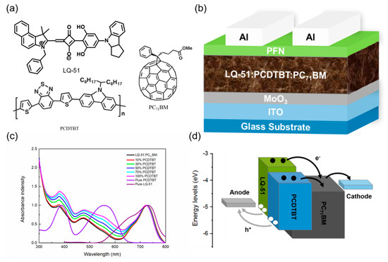 Material properties and device structure. (a) Chemical structures of LQ-51, PCDTBT, and PC71BM used in here; (b) Device architecture of organic solar cells; (c) The absorption spectra of binary and ternary films with different PCDTBT incorporation concentration; (d) The energy level diagram and proposed charge carrier transport paths in the device.