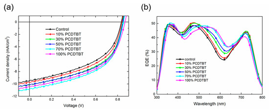 The external quantum efficiency (EQE) curves of devices are as shown in Figure 2b. In the range of 350–400 nm and 540–650 nm, the EQE increases monotonously as the incorporation concentration of PCDTBT increasing, which can be accredited to the improved photon harvesting by PCDTBT, while the rise in EQE is smaller than that in absorbance intensity, which can be attributed to less efficient electron transport pathway in ternary films. In the range of 300–350 nm and 400–540 nm, the EQE increases when the incorporation concentration is 10% and 30%, then, it decreases when the concentration of PCDTBT further increases up to 50%. The photocurrent in these ranges mainly comes from the absorption of PC71BM, and slightly from PCDTBT. The large amount of incorporation of PCDTBT would disrupt the aggregation of PC71BM and destroy the electron transport path, which will lead to lower EQE, and will be further demonstrated by the charge carrier mobility measurement in the following. The EQE in the range of 660–800 nm is related to LQ-51, which decreases slightly when the incorporation concentration of PCDTBT is 70%, and decreases dramatically when the percentage is up to 100%. The significant decrease in this range results from the weak molecular interaction between LQ-51, which will hinder hole transport in LQ-51, and lead to a lower EQE. As a result, the optimal incorporation percentage of PCDTBT is 70%, where the ternary device can enhance photon harvesting and maintain efficient charge carrier transport simultaneously.