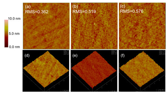 The atomic force microscope (AFM) height images and 3D images of (a,d) control binary film; (b,e) ternary blend film with 70% PCDTBT; (c,f) ternary blend film with 100% PCDTBT. The scan size of all images is 5 × 5 μm.