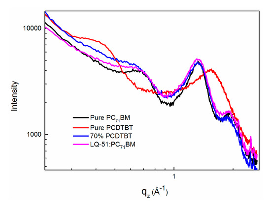 The out-of-plane grazing incidence X-ray diffraction (GIXRD) of pure PC71BM, pure PCDTBT, LQ-51/PC71BM binary film, and 70% PCDTBT-incorporated ternary film.