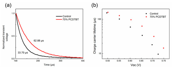 We further study the charge carrier characteristics in the binary and ternary device through transient photovoltage (TPV) measurements. The solar cells were exposed to a stabilized white light under open-circuit condition. When the VOC of solar cells was kept at 0.65 V, the charge carrier lifetime was 33.70 μs and 62.88 μs for binary and ternary devices (as shown in Figure 7a), respectively. Then, we changed the distance between light source and solar cells to keep the device under different VOC conditions. The charge carrier lifetime of the ternary device is much longer than that of the binary device under any VOC condition (as shown in Figure 7b), which indicates less charge carrier recombination in the ternary solar cell. The incorporation of PCDTBT would add another hole transport pathway, which combined with high hole mobility of PCDTBT can significantly enhance charge extraction and reduce charge carrier recombination in ternary devices. Therefore, the FF and PCE increase significantly when 70% PCDTBT is incorporated.