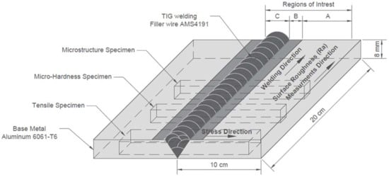 Geometry of TIG-welded Al6061-T6 specimen and schematic of testing specimens showing welding and surface roughness measurement direction.