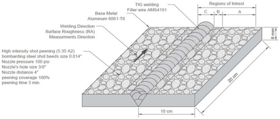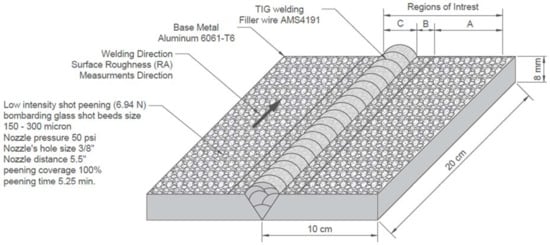 This solution and precipitation heat-treated lightly oil coiled sheet aluminum alloy was produced according to aerospace materials specifications AMS4027N (ASTM B209-14). Rectangular specimens of 10 cm × 20 cm and 8 mm thickness were cut and then butt form welded according to AWS17.1 standard using filler wire of AMS4191. The TIG welding was carried out under 99.99% pure argon shielding gas and 72 amps AC welding current. In addition to the control sample (only TIG-welded, see Figure 1), two other sets of TIG-welded samples were prepared for shot-peening. The welded samples were subjected to two shot-peening scenarios after the welding: high-intensity and low-intensity shot-peening. The controlled shot-peening treatment was performed on the Al6061-T6 alloy by means of an E-S-1580 Pangborn-controlled shot-peening machine.