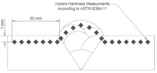 Vickers hardness measurements were performed on shot-peened treated samples at both intensities along with the control samples. Measurements were performed according to ASTM E384-11ɛ1 standard on a Tru-Blue united hardness tester (Tru-Blue U/10 version F13, San Diego, CA, USA) by applying a 10 kg load for 15 s dwell time. Four measurement sets were taken on the cross section of the mounted samples, 1 mm away from the shot-peened surface (see Figure 4).