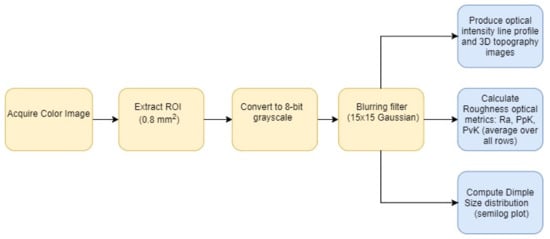 The image processing steps are summarized in the block diagram shown in Figure 5. The acquired color images are cropped to represent a square of 0.8 mm2 for all regions of interest. The region of interest (ROI) image is then converted to an 8-bit grayscale image where an intensity value of 0 represents black, and 255 represents white. The image is then blurred to produce smoother intensity histograms, i.e., more natural intensity level distribution, where all intensities are present. From there, it is possible to produce line profiles and approximate 3D topography images for qualitative comparisons. In addition, further processing produces optical roughness and hardness metrics that correlate with the measured data produced using specialized laboratory tools such as SJ-210 Mitutoyo for surface roughness and Tru-Blue U/10 for hardness. Lastly, a matched filter process on the 2D image produces dimple size distribution plots that can be used qualitatively to compare the roughness of imaged sample regions. More details about these steps are presented in the example shown in Figure 6.