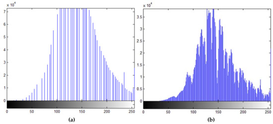Intensity histograms of a low-intensity shot-peened sample: (a) before blurring; (b) after blurring.