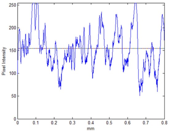 In order to investigate the samples’ surface, it is helpful to generate an optical line profile of the ROI along with the average intensity on that line. Such a profile, shown in Figure 8, approximates the line topography, where high-intensity pixels represent elevated points and low-intensity pixels represent low elevation points. This shows the pixel intensities of a horizontal line through the center of the ROI, i.e., the center row of the example image in Figure 6. Similarly, an optical approximation of the 3D topography can be generated and used for qualitative analysis. This is shown in Figure 9 for the same example in the image presented in Figure 6.