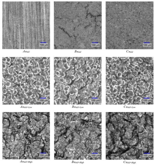 As for Figure 11 and Figure 12, they show that the welded sample (top row) is the least rough. The heat-affected zone, Bweld, of this sample contains microcracks that can be attributed to the temperature gradient and difference between the high-temperature left side and low-temperature right side, and the uneven cooling after welding. Hence, a post-weld shot-peening treatment is necessary for the crack closures. It is also evident that the sample that was shot-peened with high intensity (bottom row in the figures) is the roughest. This is plausible since the high-intensity shot-peening was performed with small steel balls, while the low-intensity shot-peening utilized ground glass balls. To study the roughness across zones A, B, and C, Figure 11 and Figure 12 must be viewed column-wise. It can be concluded that the heat-affected zone (region B) has the least roughness compared to the weld bead (region C) and the unaffected area (region A); shot-peening did not change the relative roughness. In addition, low-intensity shot-peening closes microcracks, as can be seen by comparing the top two images in the center column of Figure 11. High-intensity shot-peening not only closes the microcracks, but also introduces major surface deformations.