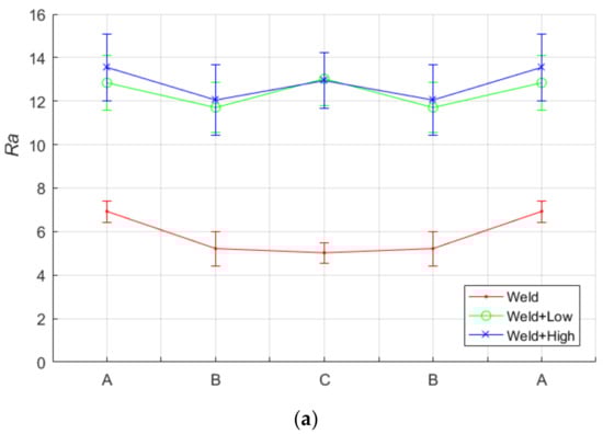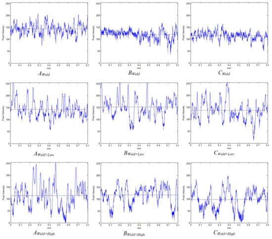 To validate the method of optically obtaining roughness measurements, three samples were chosen: A welded sample without shot-peening; a welded, low-intensity shot-peened sample; and a welded, high-intensity shot-peened sample. The ROIs for these samples are shown in Figure 11, and three regions for each sample are defined as in Figure 2. These regions are A (Base metal alloy), B (the heat affected zone), and C (the weld beads). Figure 12, Figure 13, Figure 14, Figure 15 and Figure 16 are all based on these selected samples’ ROIs.