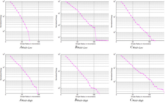Further image analysis was performed to find the distribution of dimple size in each of the shot-peened ROIs. These results are shown in Figure 14. The number of dimples was counted for a size range from 20 to 150 micrometers. This was achieved by running a matched filter with a variable-diameter disk as a filter mask. The analysis shows that the low-intensity shot-peened ROIs (top row) do not contain dimples larger than 100 micrometers, whereas the high-intensity shot-peened samples do. Within the sample, using row-wise inspection, it is evident that the heat-affected zones in BWeld+Low and BWeld+High have the most dimples of 100-micrometer size.