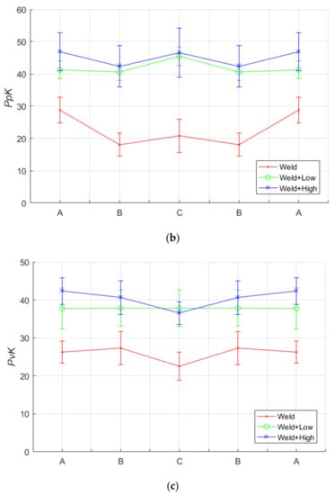 Optical roughness metrics (in %) for three samples in the three ROIs shown in Figure 11. (a) Ra; (b) PpK; (c) PvK.
