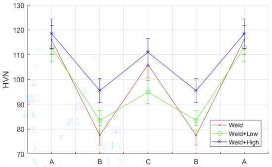 This was attributed to the higher hardness of the weld beads zone (region A) compared to the heat-affected zone (region B), which made it less affected by the shot-peening intensity after a certain level. Hence, it is concluded that a measurement of sub-surface hardness is necessary, as shown in Figure 16. It was observed that the surface roughness profile somehow mimics the hardness profile for both high- and low-intensity shot-peened samples, where the W shape was observed. This was attributed to the higher hardness region, which corresponded to higher hardness values; as a result, it is less affected by shot-peening surface treatments.