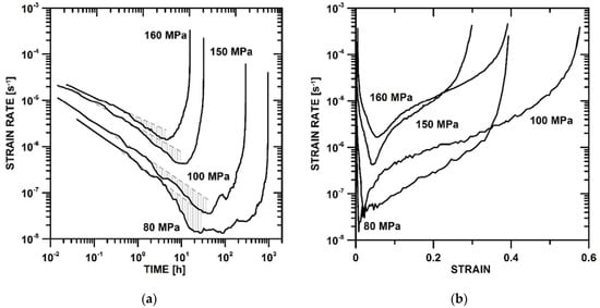 The curves of creep strain rate vs. strain exhibited a systematic decrease of strain to the minimum creep rate with a decreasing value of initial stress. It can be seen that the largest elongation of tensile specimens occurs during the tertiary stage (Figure 2b).