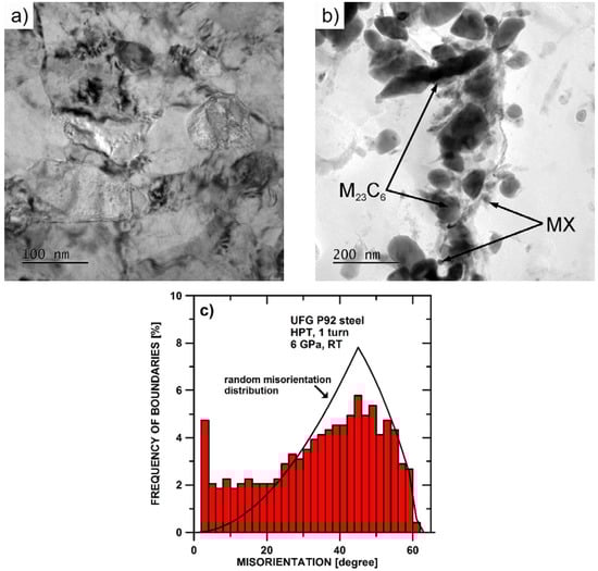 The microstructure of P92 steel processed by HPT during 1 revolution at room temperature consisted of grains with a mean size of 0.14 μm (Figure 4a). The investigation of the precipitates revealed that the microstructure after the HPT processing contained M23C6 and MX carbides (Figure 4b). The analysis of the microstructure using EBSD showed that the grain boundaries exhibited nearly random distributions of misorientation angles (Figure 4c).
