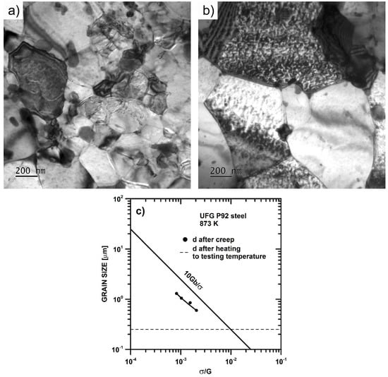 The microstructure after creep testing at 873 K and 150 MPa is shown in Figure 5. One can see that thermal exposure of the UFG microstructure in the grip part of the tensile specimen (time to fracture tf ~30 h) tested at 873 K led to the coarsening of grains (Figure 5a).