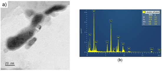 TEM micrograph of precipitates on extraction carbon replica in UFG P92 steel after creep testing at 873 K and 150 MPa: (a) Laves phase and (b) EDS spectrum of Laves phase.