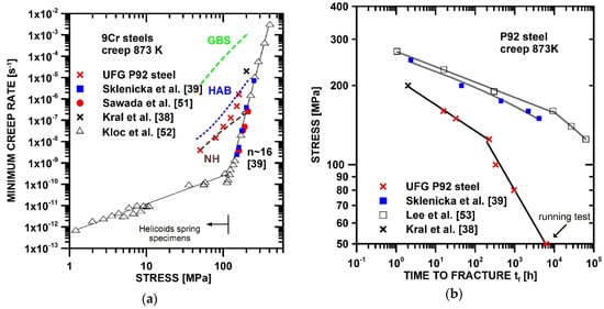 Figure 8 shows a comparison of the creep results measured in the present work with creep data published in other works [39,51,52,53] for coarse-grained 9% Cr steel. The comparison demonstrates that the transformation of tempered martensitic microstructure to a UFG microstructure led to the deterioration of creep resistance in comparison with coarse-grained P92 steel.