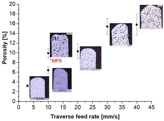 Figure 2). The porosity of samples increases with the deposition rate. For samples obtained at a deposition rate of 3 mm/s, the porosity is 3.2%, whereas for a sample obtained at a deposition rate of 30 mm/s, the porosity is as high as 15.8%. Due to the high deposition rate, the powder delivered into the laser focus spot is not fully molten (partially molten, which could initiate the formation of pores in the material), and the preset processing power is insufficient for the entire batch of powder to become molten in such a short period. Increasing the deposition rate causes shorter laser-particle interaction times. The short laser interaction time and low specific energy result in a high porosity level in the LENS fabricated sample. The smallest porosity was obtained for the longest laser interaction time of t