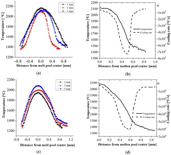 Figure 3a,c). It is also noted that the maximum temperature in the molten metal pool depends on the distance from the substrate. For samples produced with a 3 mm/s working table feed (