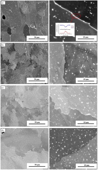 An FEI Quanta 3D field emission gun (FEG) scanning electron microscope (SEM) with energy dispersive spectroscopy (EDS) was used to determine the chemical composition in micro-regions of the material, with a particular emphasis on the Zr-enriched particles. The chemical composition was measured using an EDS detector for three different areas, calculating the mean value and standard deviation. An electron backscatter diffraction (EBSD) system coupled with the FEI Quanta 3D field emission gun scanning electron microscope (FEG-SEM) was applied in order to analyze the complex microstructure. Before the examination, the samples were ground with 120–4000 grit SiC paper, polished with 3–0.25 μm diamond suspensions, and finally polished with 0.1–0.06 μm silica suspensions. For automatic crystal orientation mapping (the ACOM technique, also known as Orientation Imaging Microscopy, the TSL OIM Analysis 5.31 commercial software (EDAX, Mahwah, NJ, USA) was used.