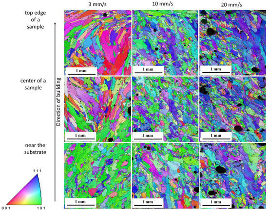 Figure 6). In contrast to the samples obtained at a feed rate of 3 mm/s, in the center and upper regions, a fine-grained structure exists. This is consistent with previous work [
