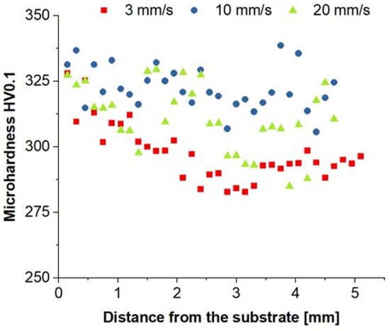 Due to the high porosity and cracks in the samples obtained at flow rates of 30 mm/s and 40 mm/s, mechanical properties were examined only for samples obtained at 3, 10, and 20 mm/s rates. Microhardness measurements were performed to compare the structural homogeneity of the samples (