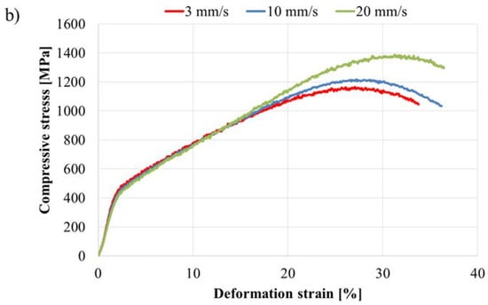 Based on these results, the traverse feed rate has no effect on the yield strength. For all the analyzed samples, the yield strength is estimated at YS = 400 MPa upon a deformation strain Ac of approximately 30%. Similar values are obtained for the cast alloy Fe30Al5Ti0.7B (460 MPa), as well as for the laser melt-deposited alloy Fe28Al (at %) being compressed in the direction perpendicular to deposition (400 MPa). A higher yield strength of 540 MPa is observed for the parallel direction and 490 MPa for the perpendicular direction for Fe30Al10Ti alloys obtained using the LMD method. The highest compression strength of 1387 MPa is obtained for a sample obtained at a flow rate of 20 mm/s, whereas the lowest compression strength of 1165 MPa is obtained for a sample obtained at a flow rate of 3 mm/s. All the samples were destroyed when the maximum compression strength was reached, with the cracks angled ca. 45° to the axis and appearing at the lateral surface of the samples in a manner characteristic for brittle materials.