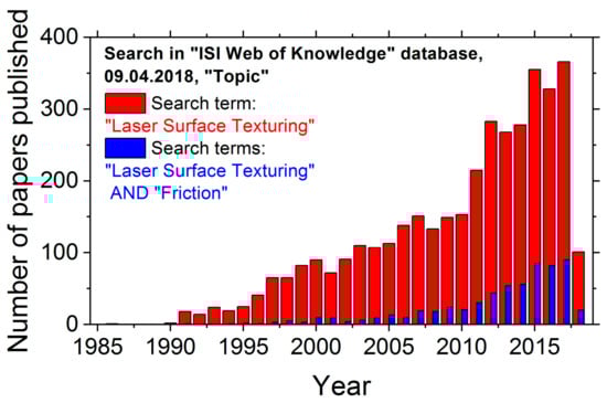 Research activities in the field of Laser Surface Texturing (LST), exemplified by the number of papers published per year—matching to the search term “Laser Surface Texturing” or to the two logically connected terms “Laser Surface Texturing” and “Friction” in the ISI Web of Knowledge database on 9 April 2018.