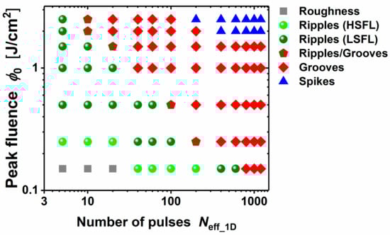 Based on our experiments, a morphological map for area processing (Figure 3) was constructed for the 100Cr6 steel material. The map reveals that HSFL ripples are formed for a low effective number of laser pulses (Neff_1D ≤ 200) and at peak fluences φ0 not exceeding ~0.25 J/cm2, i.e., close to the damage threshold of the steel. The LSFL-ripples are formed either at small Neff_1D and fluences up to a few J/cm2 or for large Neff_1D up to a few hundreds and at peak fluences below ~0.2 J/cm2. The spikes are generated for many pulses and at high fluences (Neff_1D ≥ 200, φ0 ≥ 2 J/cm2). The grooves cover the parameter range bordered by the LSFL-ripples and the spike structures.