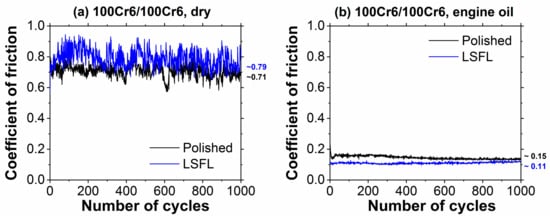 Figure 4 compares the COF measured during 1000 RSTT cycles for dry sliding at room temperature (Figure 4a) and for lubricated sliding in engine oil (Figure 4b) for both a polished reference (black curves) and for the fs-laser processed (LSFL covered) 100Cr6 samples (blue curves). Under dry conditions, the COF of the LSFL-covered surface is slightly increased compared to that of the polished reference, as manifested in average COF values of 0.79 (LSFL) and 0.71 (polished), respectively.