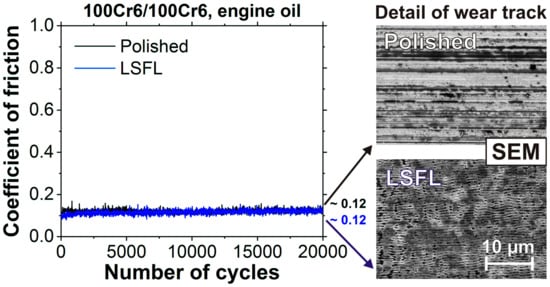 In engine oil, the COF is significantly reduced to values clearly below 0.15 (Figure 4b). Here, the fs-laser structured (LSFL-covered) surface exhibits an average COF around ~0.11 being reduced by ~24% when compared to the polished surface finish (COF ~0.15). Although being close to the experimental uncertainty, the friction reduction is in line with other studies [,,], which reported a beneficial effect of the LIPSS on steel in various lubricants/environments and under somewhat different tribological conditions.