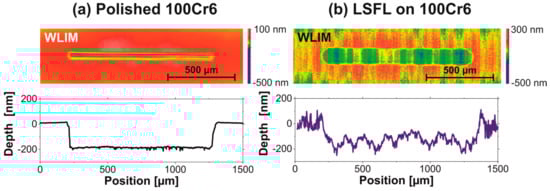 To quantify the change of the surface topography, white light interference microscopy (WLIM) was performed (Zygo, NexView, Middlefield, OH, USA) imaging the wear tracks on 100Cr6 samples after the tribological tests as shown in Figure 5. The surface topographies of the corresponding wear tracks are provided in the upper row in Figure 6a for the polished reference surface and in Figure 6b for the fs-laser processed (LSFL-covered) surfaces. Note that, at the magnification selected, the WLIM cannot resolve the LIPSS topography here. However, a surface topography modulation caused by the line-wise laser processing can clearly be seen in Figure 6b. The vertical modulation accounts to less than 200 nm here. The lower row in Figure 6 represents horizontal cross-sections through the deepest regions of the wear tracks.