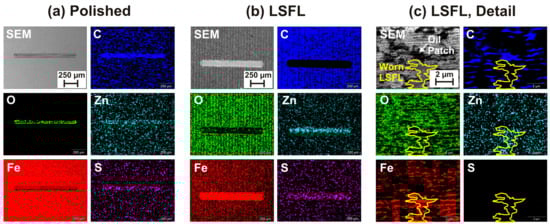 To reveal chemical alterations caused by the fs-laser processing or by the tribological tests, the wear tracks shown in Figure 6 were analyzed by energy dispersive X-ray analysis (EDX, Thermo Fisher Scientific, Thermo NSS 3.1, Waltham, MA, USA). Chemical elements related to the sample material (Fe, O, and C), or associated with the engine oil (C, Zn, and S) were mapped in and around the wear tracks. The elemental maps are assembled in Figure 7 along with corresponding SEM micrographs. The left and the middle column visualize the elemental distributions of the entire wear tracks after 20,000 sliding cycles on the polished (Figure 7a) and on the fs-laser processed (LSFL-covered) 100Cr6 steel surface (Figure 7b). More detailed high-resolution elemental maps acquired within the laser-processed wear track are provided in the right column (Figure 7c).