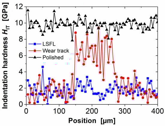 The indentation hardness HIT was averaged over a depth range between 100 and 200 nm, which is typical for the initial plastic deformation in our tribological tests. Single indentations (each separated by 5 µm) were performed along a line crossing perpendicular through the center of the wear track in the fs-laser processed (LSFL-covered) region. For comparison, the same procedure was repeated in a fs-laser processed (LSFL-covered) region without a wear track and at the polished reference surfaces.