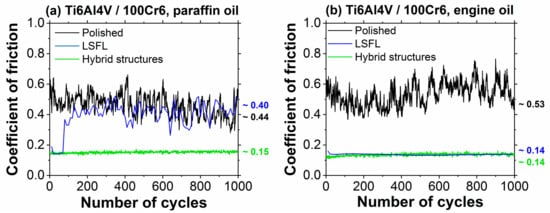 While the COF of the LSFL-covered surface tested in engine oil is at a very similar level (~0.14, see Figure 10b) as that of the hybrid micro-nanostructures over the entire range of sliding cycles, the COF of the LSFL-covered surface tested in paraffin oil starts at a similar low level, but increases significantly after ~100 running-in cycles (Figure 10a). The different behavior of the LSFL-covered surfaces in both lubricants was attributed to the presence of the additive (ZDDP) contained in the engine oil but not being present in the paraffin oil along with the laser-induced surface modifications [].