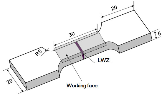 ANSI 304 SS sheets with a thickness of 5 mm were used as the welding material. The chemical composition of this material was: C (≤0.08), Si (≤1.0), Mn (≤2.0), Cr (18.0–20.0), Ni (8.0–10.0), S (≤0.03), and P (≤0.035). The sheets were treated using YLS-4000 fiber laser (IPG, Oxford, MA, USA). The butt weld was processed with full penetration. The laser welding parameters were: laser power of 4 kW, defocusing distance of −2 mm, and welding speed of 30 mm/s. The spot diameter of the laser beam was 0.27 mm with a focal length of 190 mm. Ultra-high mixed gas integrating helium (He) and argon (Ar) (1:1 mixing ratio) were used as the shielding gas during the laser welding procedure. The flow rate of adding gas was 0.6 m3/h in the condition of coaxial adding gas. The LWZ was located in the middle of the laser weldments and the width of the HAZ was small. Finally, the laser weldments were cut into the tensile samples, and they contained portions of the HAZ and LWZ in the center, as shown in Figure 1.