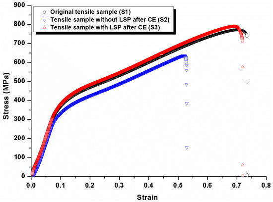 Engineering stress–strain curves of original tensile sample (S1), tensile sample without LSP after CE (S2), and tensile sample with LSP after CE (S3).