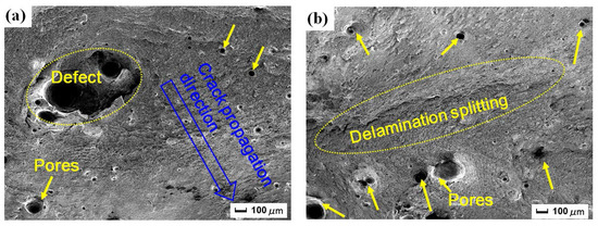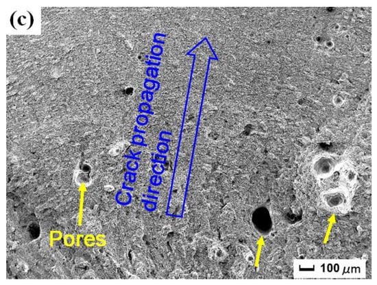 Figure 5 gives high magnification SEM micrographs of fracture morphology in the yellow square (A), (B), and (C) in Figure 4. There are pores of different sizes, but the micromorphology of fracture is different in the three groups. Figure 5a shows the high magnification micrograph in (A) of original tensile sample (S1). The plastic deformation is generated and the direction of crack propagation in the fracture surface is marked in Figure 5a. More pores appear near to the fiber zone. There is a very large pore in Figure 5a, and the pore is the defect of the laser welded sample itself. Because during the laser welding process, some pores are introduced [11], the material defect is formed and becomes crack initiation. The defect and pores grow and their size is to be larger under tensile load. Figure 5b shows the high magnification micrograph in (B) of tensile sample without LSP after CE (S2). It is found that the fracture is irregular with obvious delamination splitting and many pores. The fracture mode of S2 is brittle fracture, so the repetitive stretchable-resilient process does not exist and the delamination splitting is formed by immediate tear. There are lots of pores in the fracture surface of S2 in Figure 5b. More pores occur close to the working face subjected to CE in combination with Figure 4b, more crack initiations are introduced because of CE, and become larger under the tensile load. The material tensile property declines sharply and rapid ultimate fracture happens. Figure 5c shows the high magnification micrograph in (C) of tensile sample with LSP after CE (S3). The direction of crack propagation in the fracture surface is marked in Figure 5c in combination with Figure 4c. The number and size of pores increase closer to the fiber zone, the fiber zone with crack initiation is weak and is the important part. In comparison, the number and size of pores in the fracture of S3 (Figure 5c) is fewer than that of S2 (Figure 5b). It is explained that high-level compressive residual stress induced by LSP can delay or even restrain the growth of nanocracks.