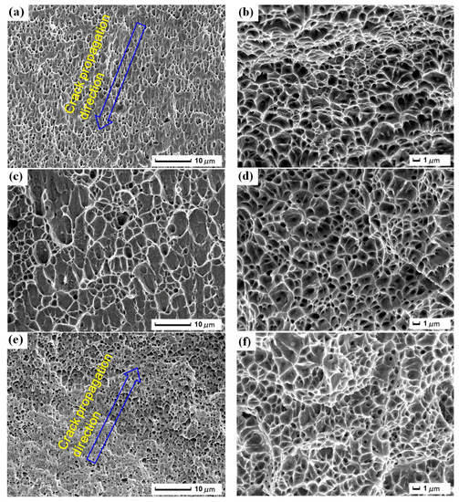 The dimples exist in the fracture in Figure 7, and are generated through the nucleation, growth and interconnection of micro-void. Figure 7a,b show the morphology of the dimples of original tensile sample (S1). Because S1 does not suffer the damage of CE and has the advantage of fiber laser welding [11], the tensile property is good. The distribution of the dimples is uniform with parabolic shape. The micro-voids are subjected to the same stress, and they are stretched along the direction of greater stress, as seen in Figure 7a, which is in accordance with the crack propagation direction. In addition, the fracture with low energy is made under plane strain condition, the size and distribution of the dimples are uniform, and the depth is deep (Figure 7b). The plasticity of the fiber laser weldment is good. Figure 7c,d show the morphology of the dimples of tensile sample without LSP after CE (S2). After CE, various nanocracks appear in S2 and the internal stresses are unbalanced. Then, various dimples are formed under the tensile load, their distribution is non-uniform, and the sample fractures easily. Moreover, the depth of the dimples is shallower in Figure 7c,d. The plasticity of S2 declines because of destruction of CE. Figure 7e,f show the morphology of the dimples of tensile sample with LSP after CE (S3). The dimples are elongated along the unified direction and the elongated direction is in agreement with the crack propagation direction. Their distribution and shape are uniform. The shape of the dimples is closely related to the stress state, and the state is stretch mode. LSP can improve the capability of CE resistance, and the formation and growth of pores are restrained. As a result, the sample is hard to fracture under the same tensile load and the elastic-plastic deformation process is long (Section 3.2). Besides, the dimples are the deepest in Figure 7f and LSP enhances the plasticity of S3.
