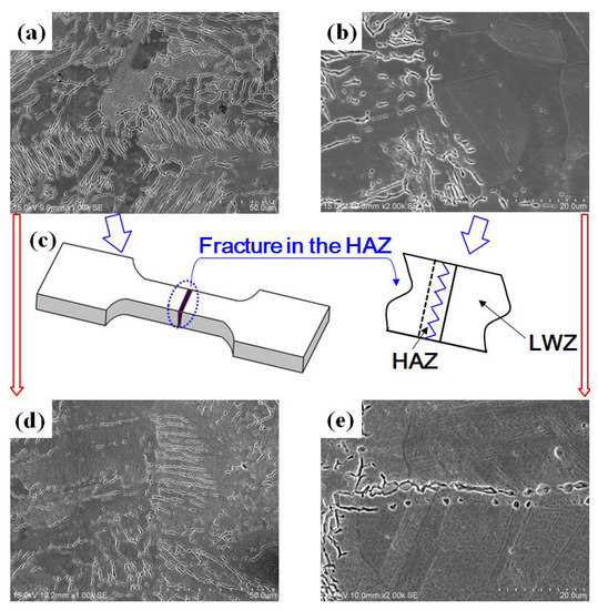 SEM morphology observation of cross sections: (a) in the LWZ without LSP [3]; (b) in the HAZ without LSP [3]; (c) fracture location; (d) in the LWZ with LSP [3]; (e) in the HAZ with LSP [3].
