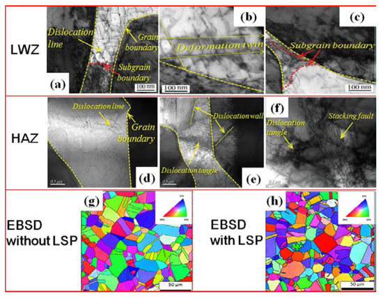 TEM observations and EBSD analysis: (a–c) in the welding zone with LSP [25]; (d–f) in the HAZ with LSP [25]; (g,h) EBSD inverse pole figures without and with LSP [26].