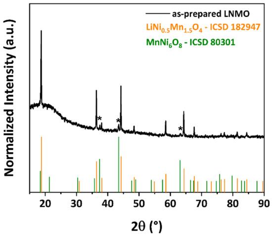 The crystallographic structure of as-prepared LNMO was analyzed by pXRD. The obtained pXRD pattern is illustrated in Figure 1. The majority of the diffraction peaks can be indexed to cubic spinel structure with the space group of Fdm. Weak reflections at 2θ = 37.5°, 43.4° and 63.6° (marked as * in Figure 1) were observed, attributed to a rock salt MnNi6O8 secondary phase, which is reported in the literature as a common impurity phase in LNMO materials [56,57,58]. As the impurity phase is electrochemically inactive within the potential window investigated in this paper, the presence of this phase would lead to lower specific capacity of the as-prepared LNMO, as it was also included in the calculation of the active material [58]. The broad diffraction peak observed within 15–25° is a measurement artifact caused by our experimental set-up.