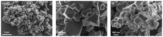The particle size and morphology of the as-prepared LNMO were analyzed by SEM. Figure 2 shows the SEM micrographs of the as-prepared LNMO. As can be seen in Figure 2a,b, most of the particles in the sample exhibited octahedral shape with the particle size of 0.5–3 µm, whereas a small fraction of octahedral particles with the size of about 100–200 nm can be observed as well. According to Chemelewski et al. [59,61], the octahedral particles consist of {111} family of planes on the particle surface. In addition, particles with irregular shape are also visible, as illustrated in Figure 2c.