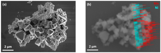 To further investigate the chemical composition of the octahedral particles and the particles with irregular shape, an agglomerate with relatively high amount of particles with irregular shape was selected and an EDX line scan was performed in the region, where particles with both morphologies were observed. As can be seen in Figure 3b, the Mn:Ni intensity ratio of the particles with octahedral shape was approximately 2–3 times higher than that of the particles with irregular shape, which indicates that the Mn:Ni molar ratio was higher in octahedral particles than in the particles with irregular shape. In addition, EDX measurements (Table S1 in the Supplementary Materials) on individual particles in TEM revealed that the particles with irregular shape exhibited significantly lower Mn:Ni molar ratios in comparison to the octahedral particles, which indicates that these particles are richer in Ni content than the octahedral ones. The pXRD results discussed above confirmed that cubic spinel phase and secondary MnNi6O8 phase coexisted in the as-prepared LNMO. Therefore, it is assumed that octahedral particles exhibited the spinel phase, whereas the secondary MnNi6O8 phase was dominant in the particles with irregular shape.