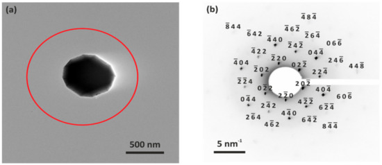 SAED pattern of as-prepared LNMO: (a) TEM micrograph of individual LNMO particle; and (b) inverted SAED pattern measured in the region of the red-circled area in (a).
