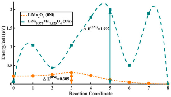 As can be seen in Figure 5, the barrier for polaron hopping for the undoped case was found to be ΔE(0Ni) = 0.305 eV (Reaction Coordinate 3), which is in excellent agreement with a previous work by Ouyang et al. [37] on the same system. To ascertain oxidation states of Mn atoms, Bader charge analysis was performed, wherein the extent of an atom is determined based on its electronic charge density, which is decided by zero flux surfaces that are used to divide atoms [69]. For Bader charge analysis of the most stable LMO state, Mn atoms were classified as either in +3 or +4 oxidation state, depending on whether they had higher or lower electronic charge than the average charge on Mn atoms. It was clearly observed that eight Mn atoms in the supercell had an average of 0.29 electronic charge more than the other eight Mn atoms. Hence, the calculated stoichiometric ratio between Mn3+/Mn4+ was 1/1 in LMO, which is what is expected.