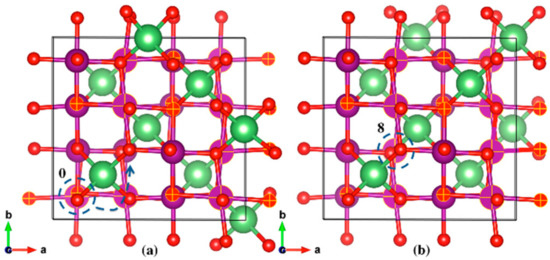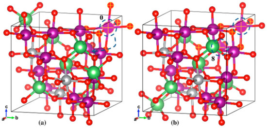 The initial and final geometric structures of the two most stable LMO polaron states are shown in Figure 6a,b, respectively. The initial (Reaction Coordinate 0) and final (Reaction Coordinate 8) locations of the JT distortion centered Mn3+ ions were also depicted in the same figure. The most stable location of the polarons (Reaction Coordinate 8 in Figure 5 and Figure 6b) was found to have columnar ordering of Mn3+ and Mn4+ as seen from the JT distortion analysis, which is also in agreement with previous studies [35]. The specific bond lengths for the initial and final states can be found in the Supplementary Materials.